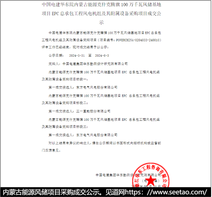 2024年6月1日获悉,中国电建华东院华东咨询内蒙古能源克什克腾旗1000MW风储基地项目EPC总承包工程在风电机组及其附属设备采购方面已经完成了成交公示。根据公示,东方电气风电股份有限公司脱颖而出,成为标段一和标段三的风电机组及其附属设备采购的首选合作伙伴;三一重能股份有限公司则凭借其优势,被选为标段二的最佳候选供应商。这两家公司在竞争中均展示了出色的实力,为项目的成功实施奠定了坚实基础。
