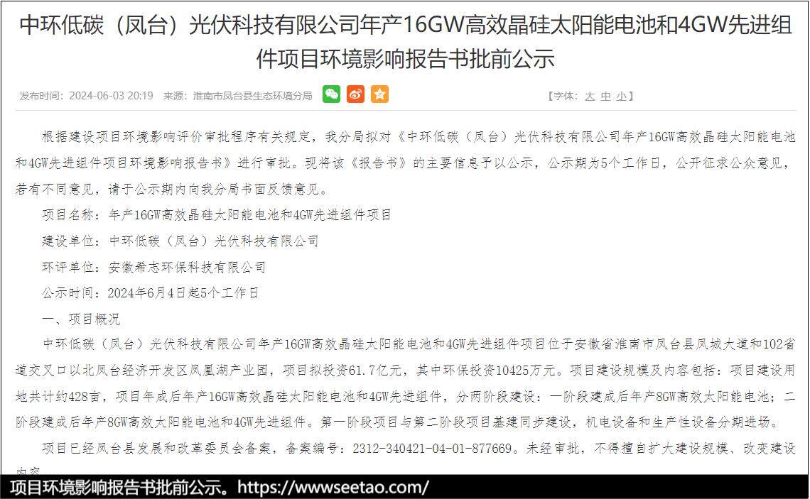2024年6月3日,安徽省淮南市凤台县生态环境分局发布《中环低碳光伏科技有限公司年产16GW高效晶硅太阳能电池和4GW先进组件项目环境影响报告书批前公示》。