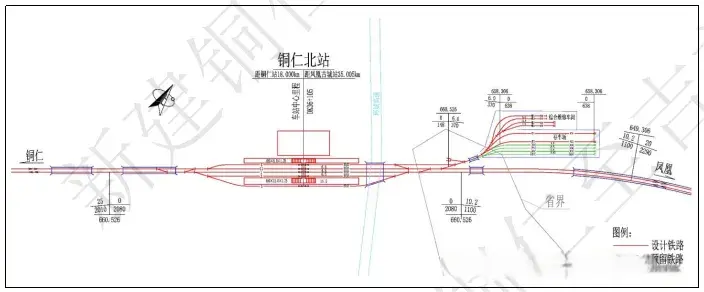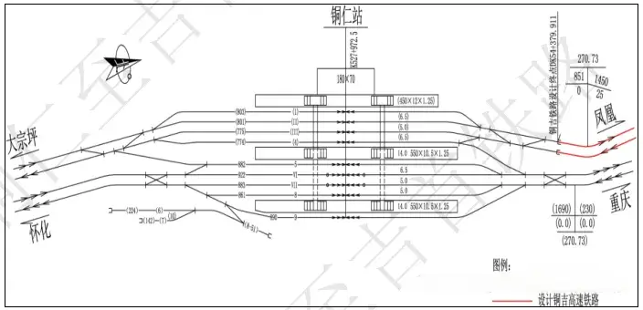 铜仁站设两个车场,普速场设到发线5条,到发线有效长850m,设550mx10.5mx1.25m中间站台2座;铜玉高速场规模为2台4线,到发线有效长650m,设450mx12.0mx1.25m基本站台1座。