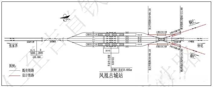 凤凰古城站为既有张吉怀铁路中间站,站中心里程为张吉怀铁路ZDK173+000,设6条到发线,岛式中间站台(450mx11.5mx1.25m) 2座,车站怀化端预留了本线以18号道岔接轨条件。