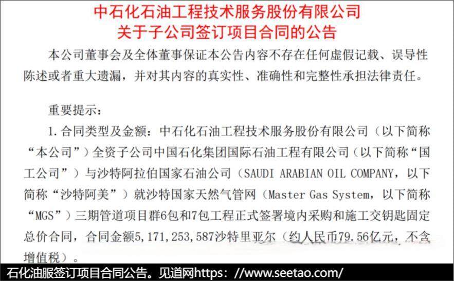 2024年6月6日晚,中石化石油工程技术服务股份有限公司公告称,公司已成功与中东地区石油行业领军企业沙特阿美达成合作协议,签署了一项价值近80亿元的重要订单,旗下全资子公司国工公司与沙特阿美签署了涉及沙特国家天然气管网三期管道项目群 6 包和 7 包境内采购和施工交钥匙固定总价合同。