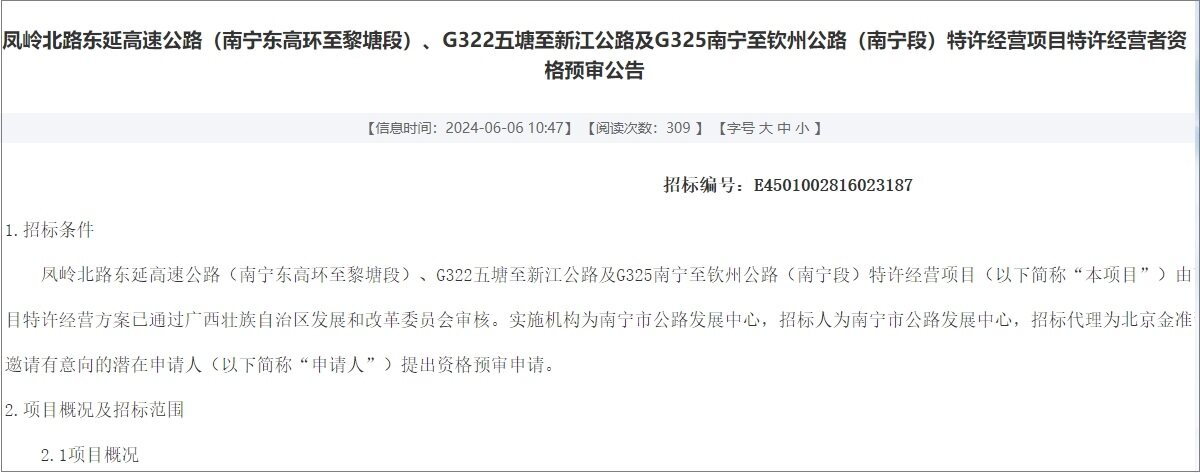 2024年6月6日,南宁市发布了凤岭北路东延高速公路南宁东高环至黎塘段、国道G322线五塘至新江公路、国道G325线南宁至钦州公路南宁段三个特许经营项目的特许经营者资格预审公告。这三个子项目的总投资额高达164.29亿元,均计划在2024年内全面开工建设,建设工期初步定为3年。这一举措预计将大幅提升南宁市及其周边地区的交通便捷性,进一步推动区域经济的融合发展。目前,各项前期准备工作正在紧锣密鼓地进行中,以确保项目能够按照既定计划顺利推进。