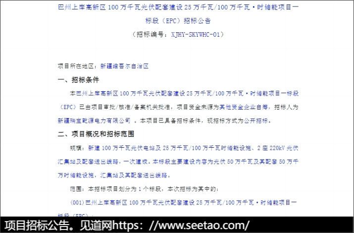 2024年6月11日,新疆巴州上库高新技术产业开发区正式发布了一项引人注目的光伏储能项目的EPC招标公告。该项目计划建设1000MW的光伏系统,并配套250MW/1000MWh的储能设施。