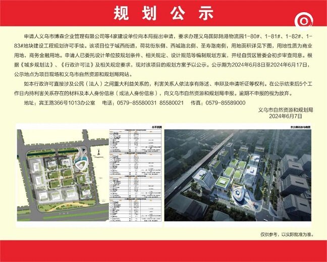 近日,义乌国际陆港物流园1-80#、1-81#、1-82#、1-83#地块项目规划方案公示,这意味着义乌国际陆港物流园这四个地块的项目正式启动,并进入了规划实施阶段。申请人义乌市博森企业管理有限公司等4家建设单位已经向义乌市自然资源和规划局提出了办理相关地块建设工程规划许可手续的申请。