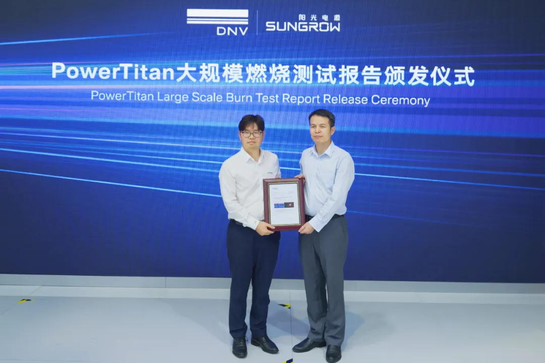 展会现场,国际权威认证机构DNV为阳光电源颁发了全球储能系统首个大规模燃烧测试证书。这是全球范围内首次采用大容量储能真机、模拟实景布局的“真枪实战”。