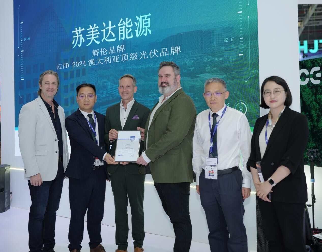 苏美达能源,作为拥有多年品牌积淀的能源央企,多年秉承“创新、可靠、可持续”的品牌理念,以卓越工艺、优质选材和严格生产流程,成为高转换效率、高可靠性光伏产品和服务的代名词。展会当天,苏美达辉伦品牌荣获EUPD Research“澳大利亚顶级光伏品牌”奖项,连续七年获此殊荣,彰显了苏美达能源在光伏行业的卓越实力和可持续发展能力。授证仪式上,EUPD Research的Daniel Fuchs与苏美达能源董事长郭宏伟,副总经理赵兴国共同出席,见证了这一荣耀时刻。