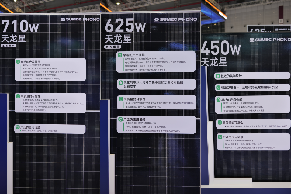 在苏美达能源的展台上,苏美达能源旗下辉伦太阳能品牌的天龙星系列组件熠熠生辉,三款明星产品惊艳亮相,覆盖小、中、大三种版型,横跨400W至700W+全功率档位,满足户用、工商业和集中式全应用场景需求。天龙星700W+组件以其高功率、高性价比的优势,为客户创造卓越价值。同时,苏美达辉伦积极推动210R技术发展,天龙星210R产品兼具高效能与最优运输成本的特点。此外,针对户用市场,特别推出了全黑设计的天龙星产品,这款全黑组件以其色彩一致、与建筑完美融合的特点,不仅提升了建筑的整体美感,更实现了清洁能源与建筑艺术的和谐统一,深受欧洲市场欢迎。