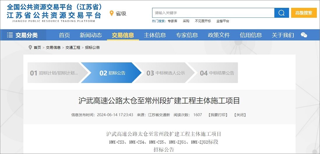 2024年6月14日,江苏省公共资源交易平台发布了沪武高速公路太仓至常州段扩建工程主体施工项目招标公告,该项目属于公路,项目总投资为360.5亿元。