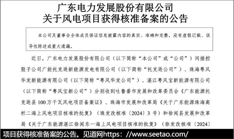 2024年7月4日获悉,粤电力的三个风电项目取得重要进展,广东能源托克逊县1000MW风电项目已成功备案,广东能源珠海高栏二海上风电项目和湛江徐闻东一海上风电项目也顺利获得核准。这三个项目的总装机容量达1900MW,总投资额高达160.1亿元。