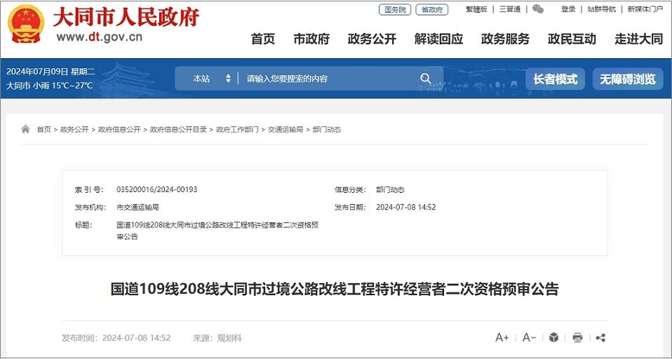 2024年7月8日,大同市人民政府发布了国道109线208线大同市过境公路改线工程特许经营者二次资格预审公告,此次招标由大同市公路发展中心发起,项目总投资高达81.1亿元。