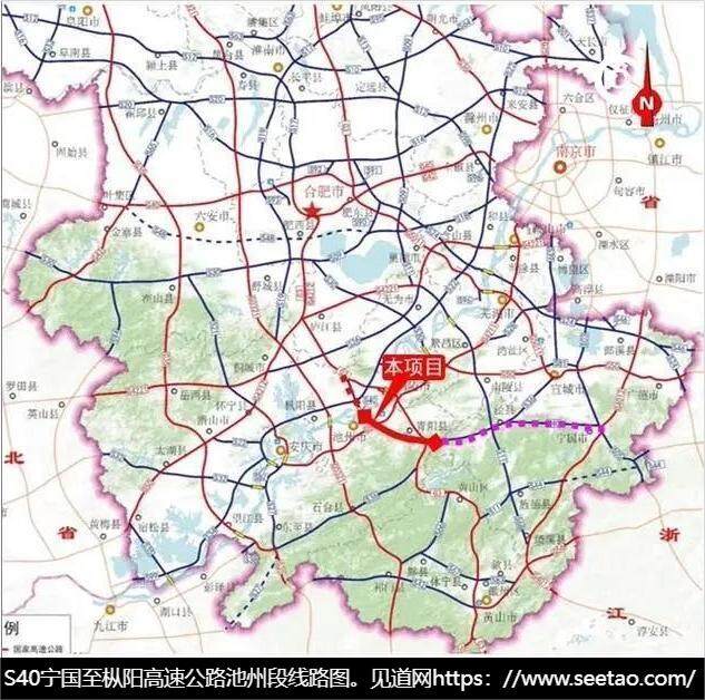 S40宁国至枞阳高速公路池州段路线起于泾县与青阳县交界处接在建的泾青高速,向西于溪田村附近与G3京台高速交叉,经杨田镇南侧,从东风水库南侧布线,上跨青通河,经九华山高铁站站前广场前,向西平行在建池黄高铁及规划合池高铁,于五溪北侧上跨G318,经墩上北,金村附近隧道方式下穿“九华密集通道”,连续上跨铜九铁路及宁安城际,于九华互通西南侧上跨G50沪渝高速,与规划合池高铁并行向北,穿东部新城,终于池州长江公铁大桥南引桥处,路线全长46.225公里,终点桩号K46+225.410,其中K45+570-K46+225.410段属于池州长江公铁大桥引桥公铁合建段,该段由铁路部门在合池高铁项目设计并施工,仅将涉及公路部分的投资纳入本项目。项目起点至杨田枢纽,建设双向四车道高速公路,设计速度为100km/h,路基宽26m,长度约3.670公里;杨田枢纽至观前枢纽,建设双向四车道高速公路,设计速度为120km/h,路基宽27m,长度约33.498公里;观前枢纽至终点池州长江公铁大桥南岸引桥,建设双向六车道高速公路,其中观前枢纽-池州东互通段设计速度 120 km/h,池州东互通至终点段设计速度100km/h,路基宽34.5m,长度约9.057公里。