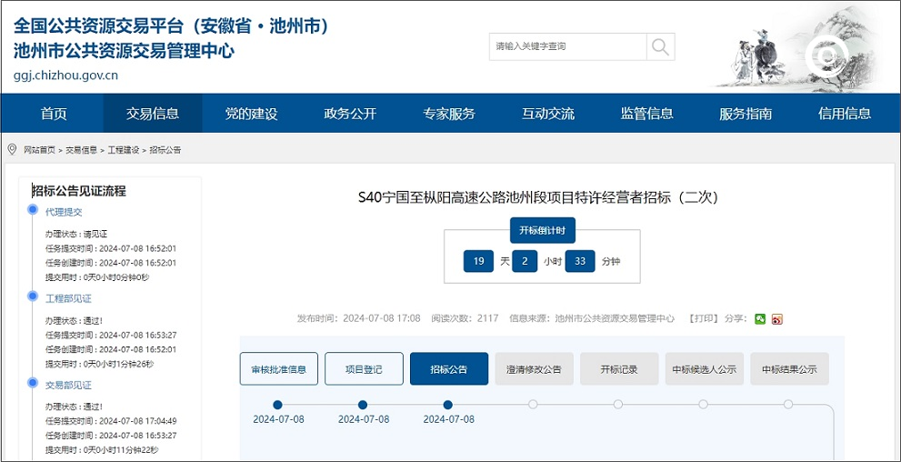2024年7月8日,池州市公共资源交易管理中心发布了S40宁国至枞阳高速公路池州段项目特许经营者招标公告(二次) ,该项目所属行业公路,招标人池州市交通运输局,项目总投资104亿。