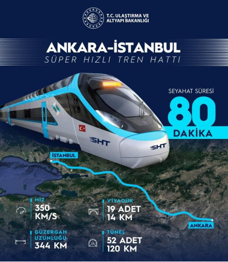 连接土耳其首都安卡拉和经济中心伊斯坦布尔的新高速铁路线长344公里,沿途需要建设52条总长120公里的隧道和19座总长14公里的高架桥。建成后,两地间通行时间将从目前的4小时20分钟大幅缩短至仅需1小时20分钟,新线路的实现将得益于引入最高时速可达350公里的新型高速列车。