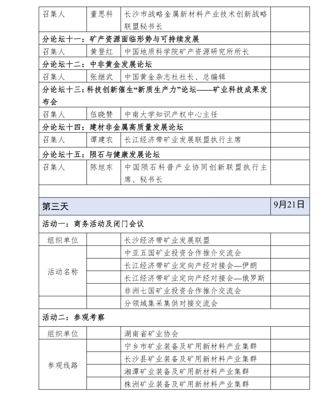 此次活动采用“会+展”相结合的形式,计划分三天进行,包括20场国际专业论坛、100场企业间商务峰会。推动我国矿业技术装备等企业发展从“单兵作战”变成全链推进,产业发展从“单体突进”迈向产业集群崛起。同时,展会也将为一带一路建设、中非经贸深度合作打开新空间,预计来自中亚、非洲、拉美、RCEP等30个国家和地区的政府官员、行业协会等参会。