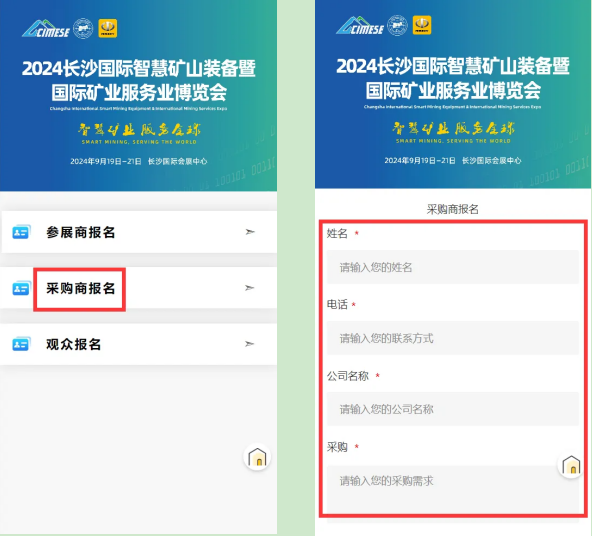 除直接扫描报名二维码外,CIMESE组委会在官方公众号:长沙国际矿博会(ID:CIMESE2024)菜单处也嵌入了报名入口。
