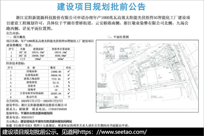 2024年7月18日,浙江平湖市国土空间规划科正式对外公示了浙江宏阳新能源科技股份有限公司即将启动的年产1000MW高效太阳能光伏组件5G智能化工厂建设项目的预先审批公告,标志着该项目即将迈入实质性建设阶段。