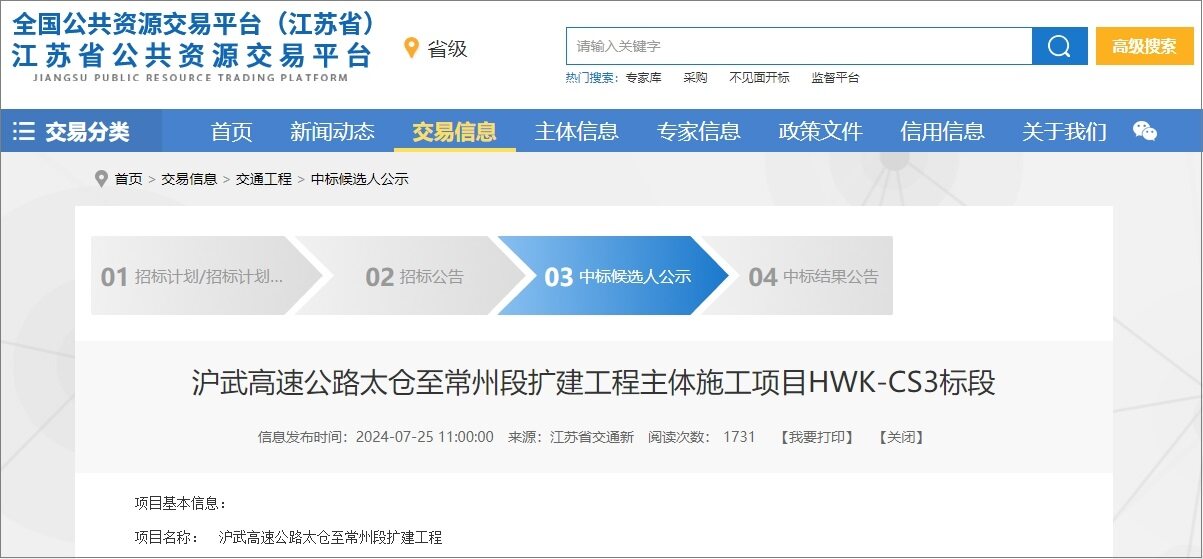 2024年7月25日,江苏省公共资源交易平台发布了沪武高速公路太仓至常州段扩建工程主体施工项目中标候选人公示,本次中标标段分别为HWK-ZJG1至HWK-CS5,详情如下: