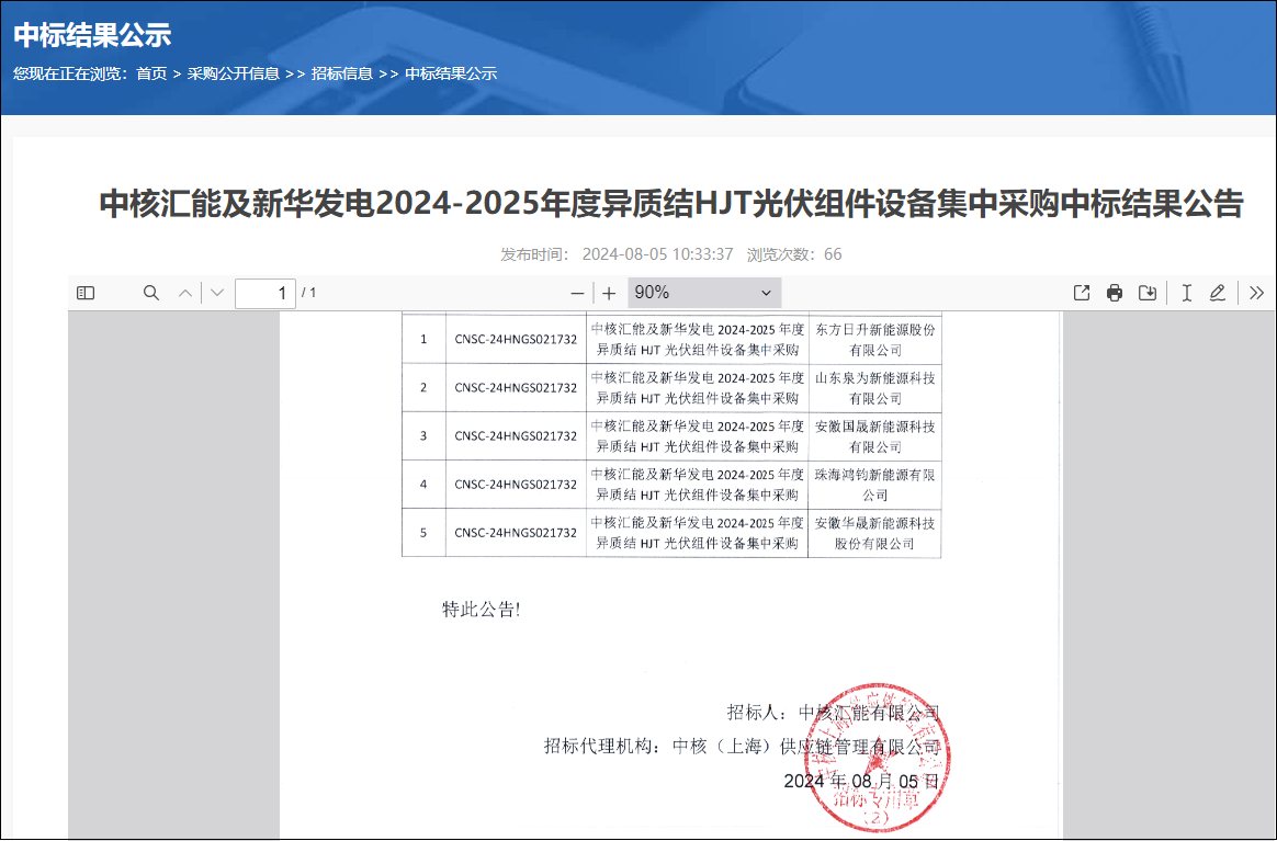 2024年8月5日,中核汇能及新华发电2024-2025年度2GW异质结(HJT)光伏组件设备集中采购中标结果正式公布,共计5家企业中标,分别为东方日升、泉为科技、国晟科技控股国晟新能源、鸿钧新能源、华晟新能源。据7月底的开标文件显示,本次异质结组件项目集采规模为2GW,是迄今为止第二大异质结组件大型项目招标,共计吸引了11家企业参与投标,除了本次中标的5家企业外,还包括天合光能、国电投新能源、中能创、金刚光伏、润海新能源、中建材浚鑫等企业也参与了投标。