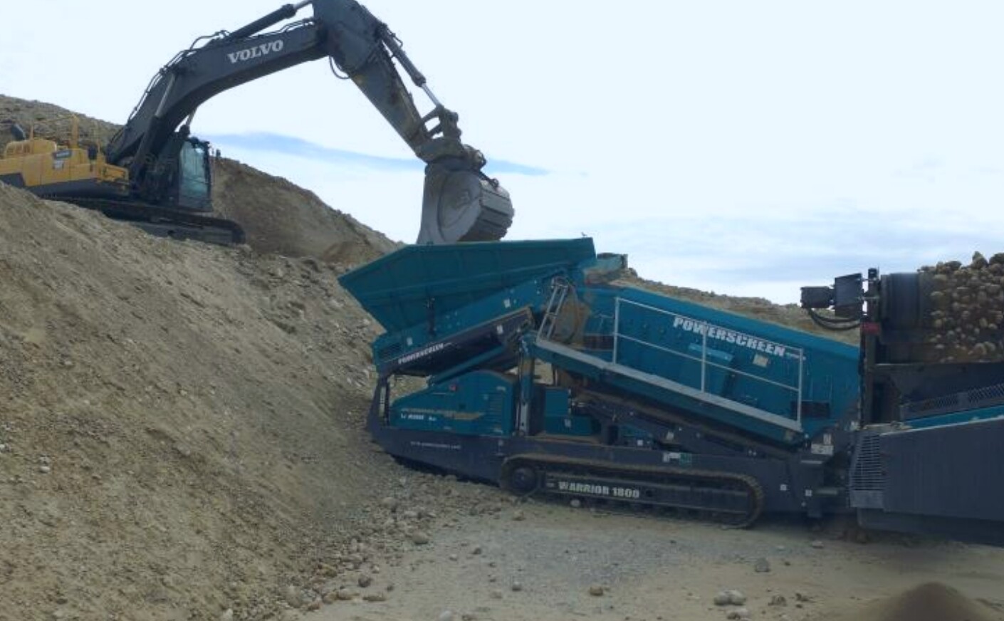 Powerscreen团队精心配置了Warrior 1800、Chieftain 1700及1000 Maxtrak等高性能破碎筛分设备。Warrior 1800作为剥离重筛,配备125mm上层冲孔板和精细的底层筛网,可以有效处理原料中的大块石料,同时也能避免过度破碎导致的细粉增加。两台Chieftain 1700筛分机则分别负责不同粒级的筛分工作,其中一台特别设置了回料系统可以将超规格物料返回圆锥破碎腔,以确保筛分效率与精度。