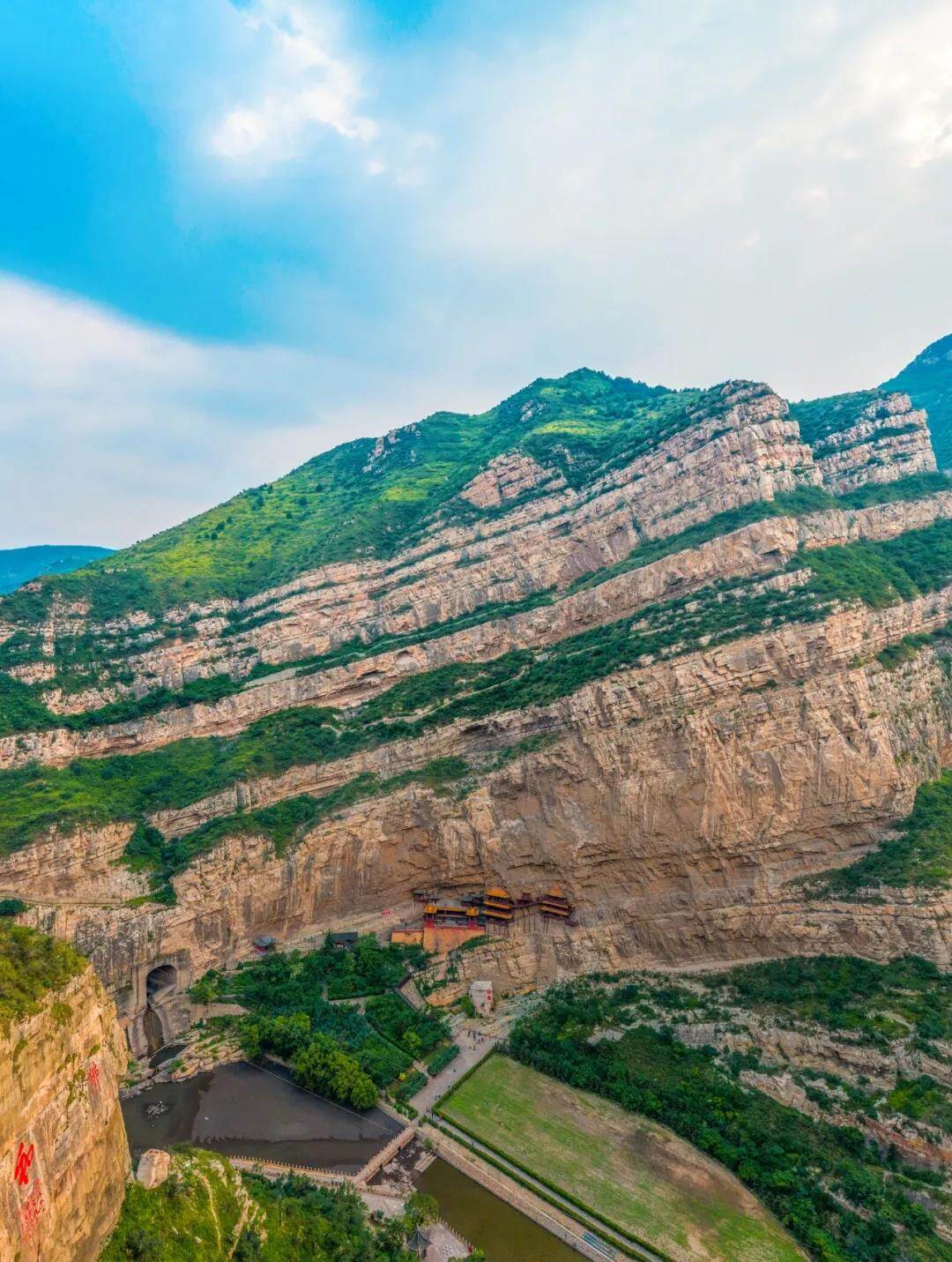 其次悬空寺的奇迹,也是选址的奇迹。它的选址烘托了“悬空”效果,还为悬空寺增添了许多优势。悬空寺倚靠的翠屏峰,山腰为一处天然凹槽,顶部自然向外延伸,可以阻挡雨水冲刷,较高的位置又避免了洪水的侵袭。