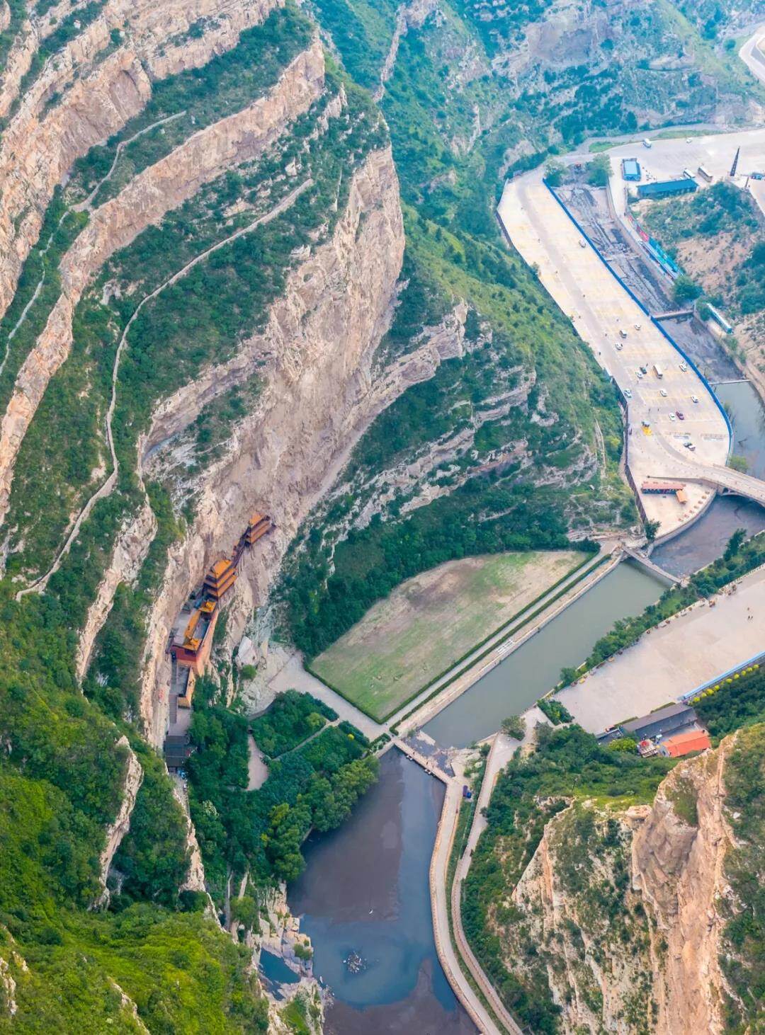 佛道争夺信众,皇帝贵族又倾力支持,这些都为建造更具想象力的寺庙奠定了基础,它必须建于特别之处,展现特别的效果,令人特别地崇敬。悬空寺正是在这样的背景下应运而生。寺庙的建造者,选择了恒山脚下的一处山谷,山谷东侧是主峰天峰岭,西侧是海拔1600余米的翠屏峰,中间是桑干河的二级支流唐峪河,山景、水景营造出仙境福地。连接国都与华北平原的栈道又从山谷穿过,南北行人往来穿梭。既是“仙界”,又接近红尘,堪称寺庙的绝佳选址。