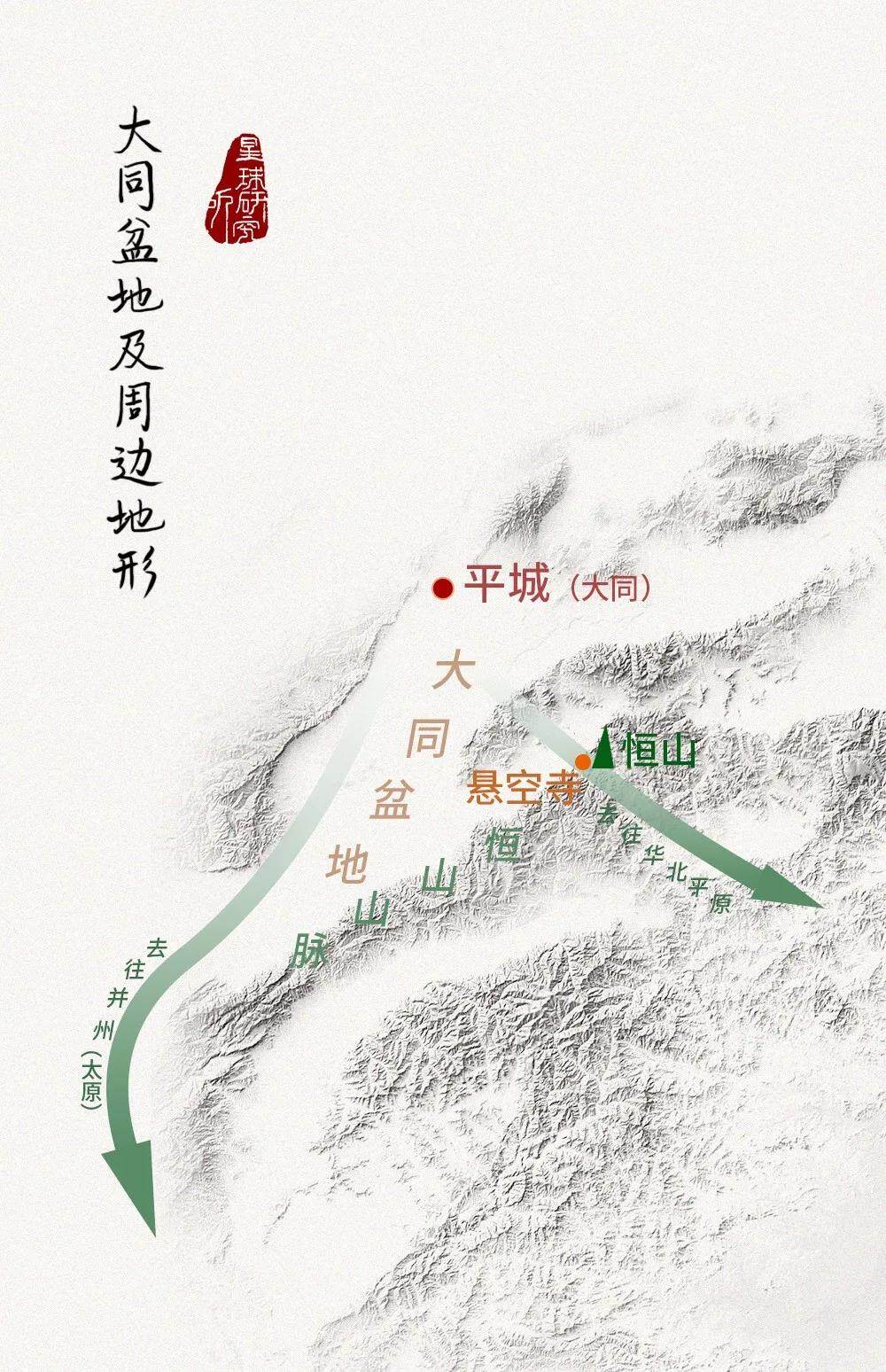 皇帝坐镇天险之中,以两条交通要道控制中原,一条纵贯山西,南抵并州(太原),一条凿穿恒山,连接华北平原。