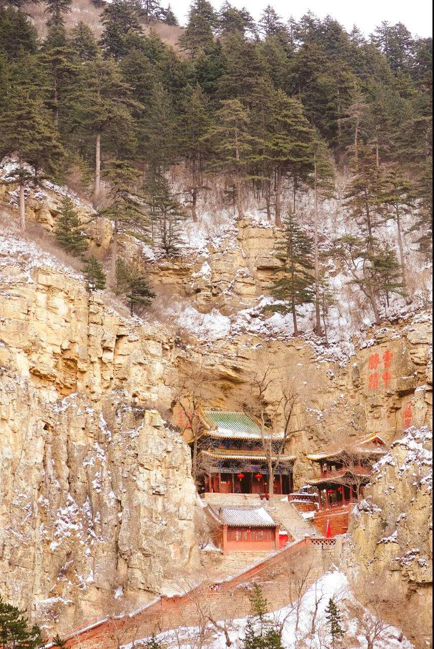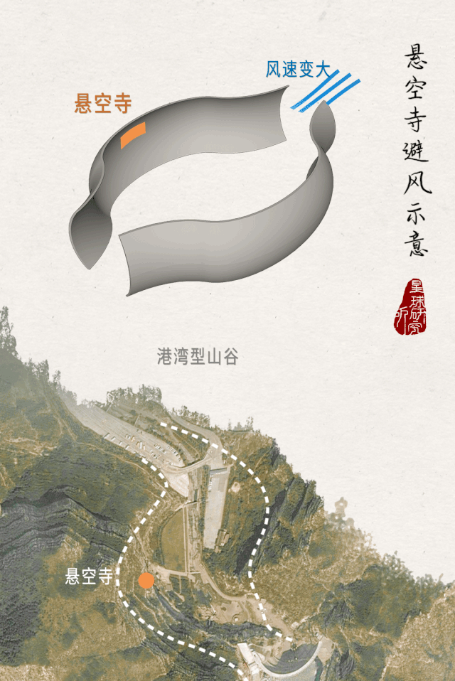 翠屏峰和天峰岭之间形成港湾形山谷,起到避风港的作用,减少了风对悬空寺的侵蚀。就像慈母的双手将它捧在掌心全方位地呵护。
