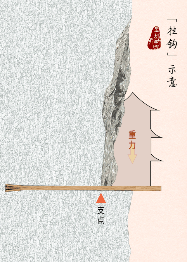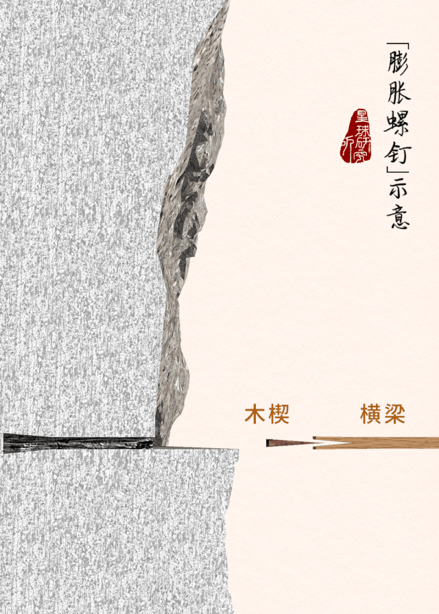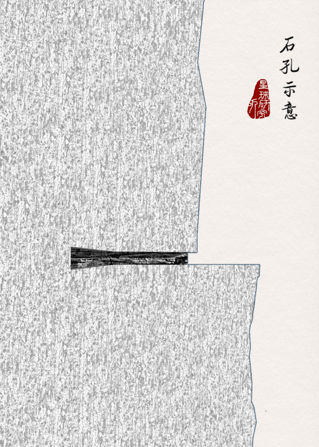 再在平台上凿出巨大的石孔,石孔内大外小深达数米,“挂钩”将在这里安装。