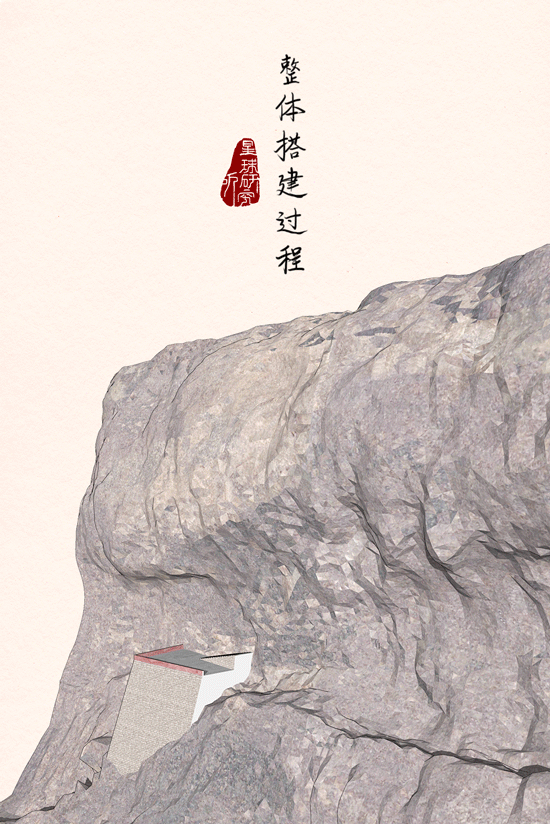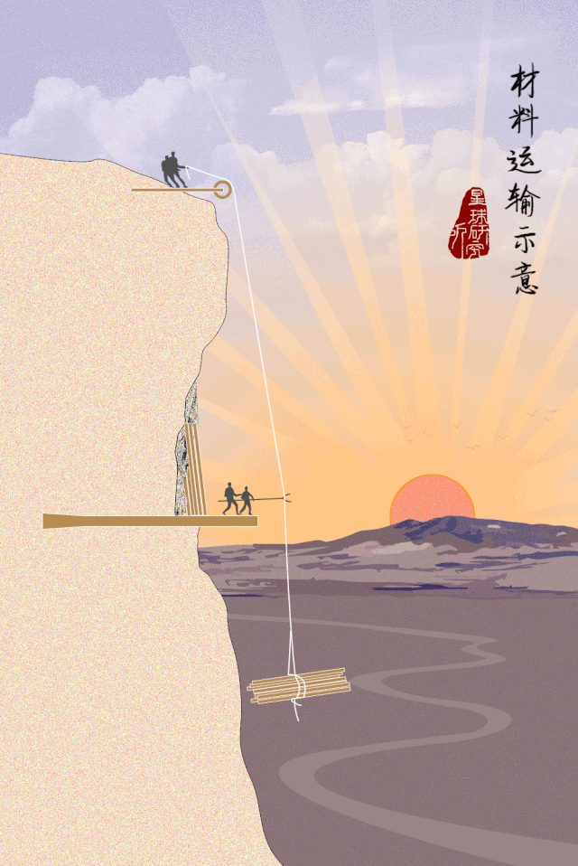 有了“挂钩”之后,工匠们再次展开“悬空作业”,将建筑材料运上山崖,再悬吊至“挂钩”处。