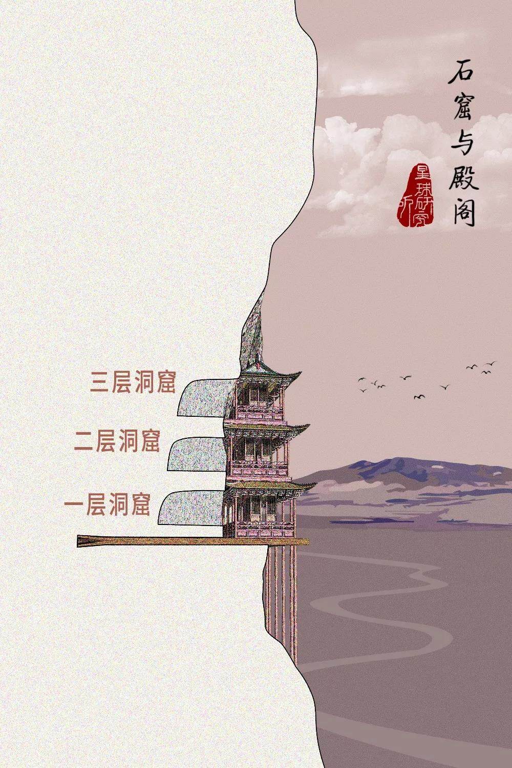 而在殿阁内部,为了获取更大的空间,工匠们向山体一侧继续挖掘出石窟。窟连殿,殿连窟,形成木结构高空摩崖建筑。