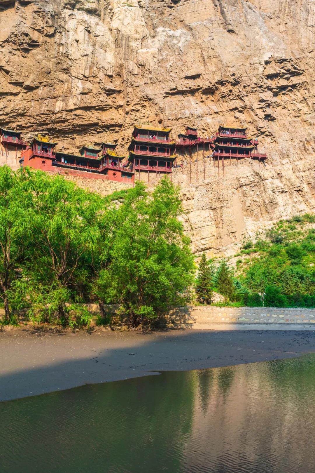 悬空寺就位于这样的山水之间,其最高处的殿阁底部,距离下方河谷约90米相当于30层楼或自由女神像的高度。