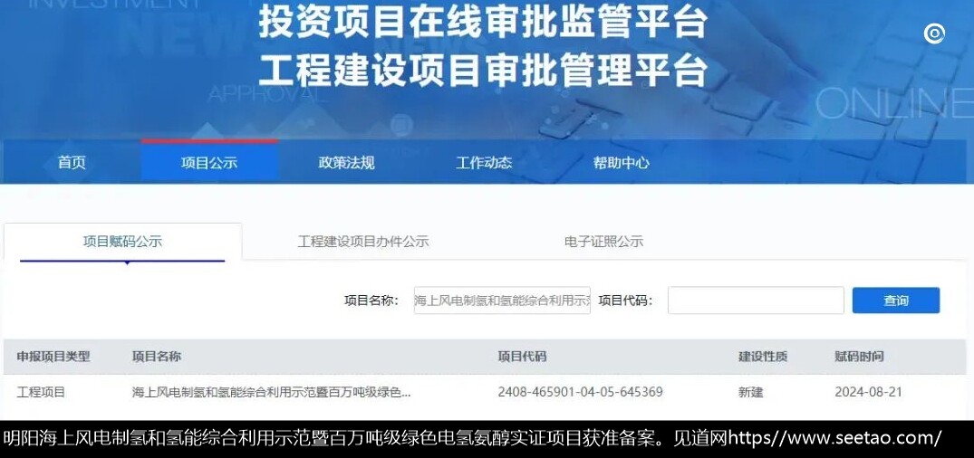 2024年8月30日获悉,近日,明阳海上风电制氢和氢能综合利用示范暨百万吨级绿色电氢氨醇实证项目(一期工程)获准备案。
