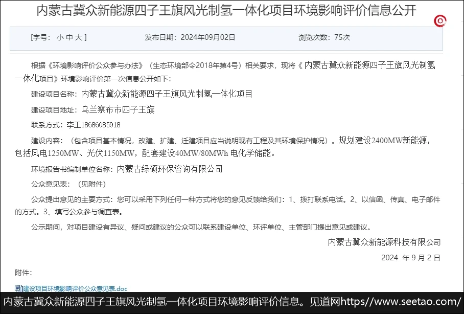 2024年9月2日获悉,内蒙古冀众新能源四子王旗风光制氢一体化项目环境影响评价信息公开。
