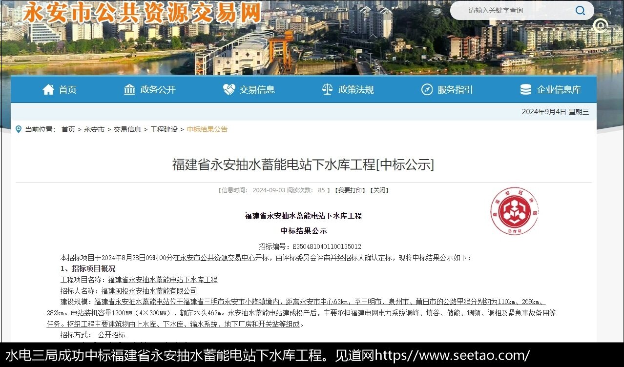 近日,中国水利水电第三工程局有限公司(简称“水电三局”)凭借其卓越的专业能力和雄厚实力,成功摘得福建省永安抽水蓄能电站下水库工程的中标桂冠,中标合同金额高达462,840,066.00元。