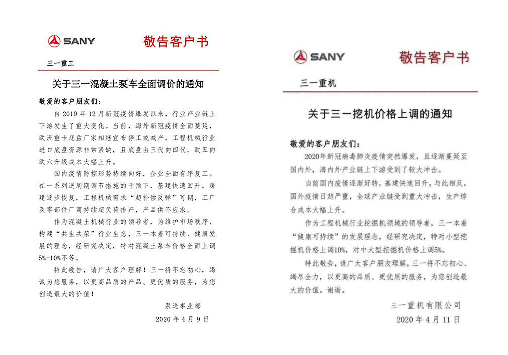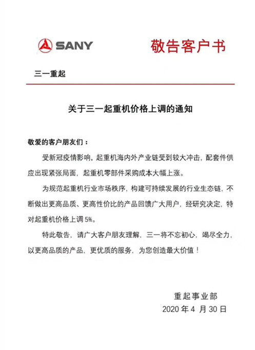受全球疫情影响,进口零部件价格上涨,从而生产周期拉长,2020年4月30日,三一重起事业部发布《敬告客户书》,宣布受新冠疫情影响,起重机海内外产业链受到较大冲击,配套件供应出现紧张局面,起重机零部件采购成本大幅上涨。为规范起重机行业市场秩序,构建可持续发展的行业生态链,不断做出更高品质、更高性价比的产品回馈广大用户,经研究決定,特对起重机价格上调5%。