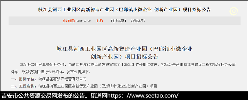 近日,吉安市公共资源交易网发布了《峡江县河西工业园区高新智造产业园(巴邱镇小微企业创新产业园)项目招标公告》。详情如下: