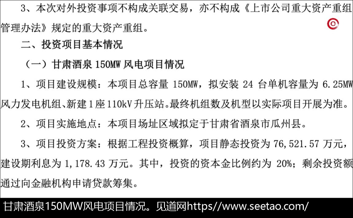 具体而言,甘肃酒泉地区的首个150MW风电项目将安装24台单机容量为6.25MW的风力发电机组,预计静态投资达7.65亿元;另一100MW项目则规划了16台同规格机组,静态投资约为5.55亿元。