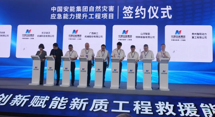 本次展会围绕“智慧应急,安全新时代”为主题,邀请多家应急行业企业参加,参展的专业救援装备覆盖了水、陆、空及地下空间等多种任务场景。本次詹阳重工作为重要参展代表,展出了水陆两栖全地形车、甲壳虫(全地形无人矩阵平台)编组,大会期间,公司党委书记、董事长、总经理吕黔出席“中国安能集团自然灾害应急能力提升工程项目签约仪式”,先后与中国安能一局、二局、三局进行签约,展示了詹阳重工与中国安能集团在应急抢险救援装备板块长期友好的合作关系。