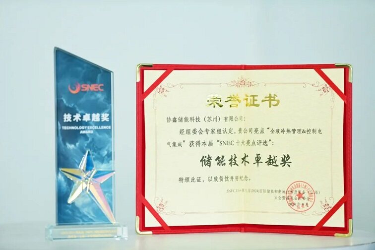 SNEC第九届 (2024) 国际储能和电池技术及装备(上海)大会暨展览会于2024年9月25-27日在上海新国际博览中心成功举行;收官之际,最引人瞩目的焦点活动“十大亮点”评选及颁奖典礼盛大揭晓。协鑫储能科技凭借“全液冷热管理&控制电气集成”这一创新技术,荣获最高奖项“卓越奖”。