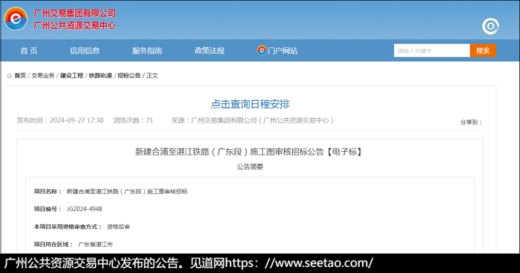 2024年9月27日,两大关键性招标公告:新建合浦至湛江铁路广东段的《施工图审核招标公告》与《建设用地勘测定界及用地报批招标公告》正式对外发布,这一举措预示着项目在通过施工图审核并获得批复后,将迅速迈入实质性的施工招标阶段。同时,土地勘测定界、用地审批及不动产权登记等前期工作也将紧锣密鼓地同步推进,标志着合湛高铁距离其预定的年底前开工目标又迈出了坚实的一步。