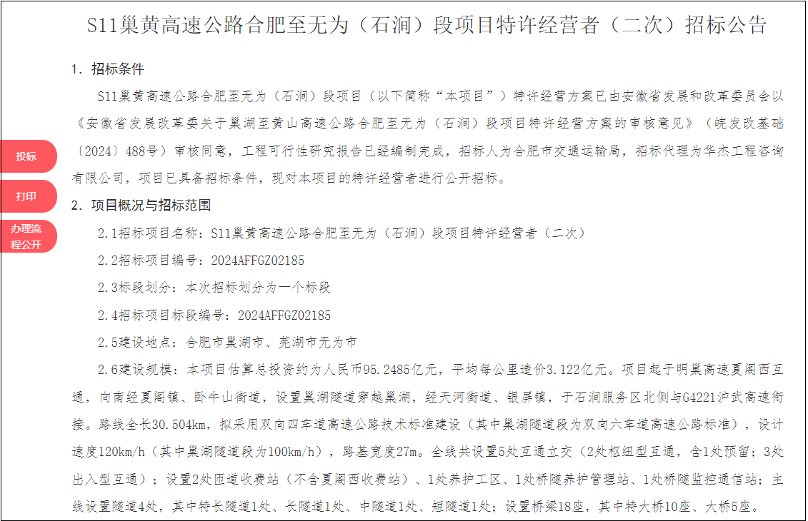 近日,安徽省S11巢黄高速公路合肥至无为(石涧)段的特许经营者二次招标公告已正式对外发布,标志着该项目即将进入实质性的开工建设阶段。总投资95.25亿元,平均每公里造价约3.122亿元,此项目已成为近期安徽省内备受瞩目的重大基础设施建设项目。
