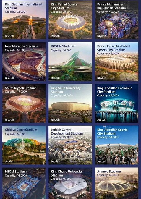 沙特阿拉伯计划建造11座新球场,作为其申办2034年世界杯的一部分。这些球场分布在利雅得、吉达、科巴尔、阿卜哈和新未来城五个城市中。其中,新未来城体育场计划位于“线形城市”,这是一个拟议中的长达106英里的线性城市,拥有两座平行摩天大楼,由人行道连接,横跨沙漠和山脉。
