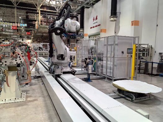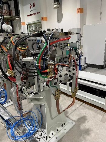 交大智邦在与某汽车行业实施的钢铝混合车身试制验证线建设项目中,面临的难点在于需要采用一台具有七轴功能的机器人集成多种焊接工艺,包括1把FDS(摩擦搅拌焊)枪、4把SPR(自冲铆接)枪、2把铝点焊枪、2把钢点焊枪以及1把无铆枪,以满足不同材质车身部件的焊接需求。