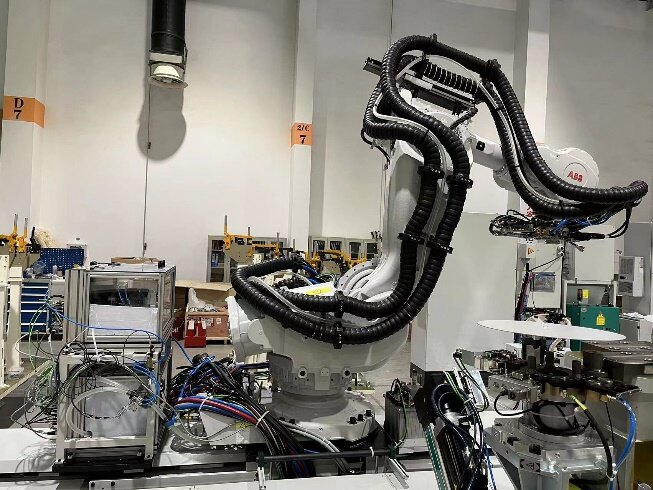 接下来的两个月里,在igus易格斯专业技术团队的指导下,项目组成功设计并实施了电缆集成方案。巧妙地将10把枪的所有电缆通过两层精心设计的管线包从机器人的第1轴一路延伸至第6轴,并最终成功地集成在第8轴上。这样不仅确保了每把枪的功能得以充分发挥,还保证了机器人在高速运作下的顺畅无阻。