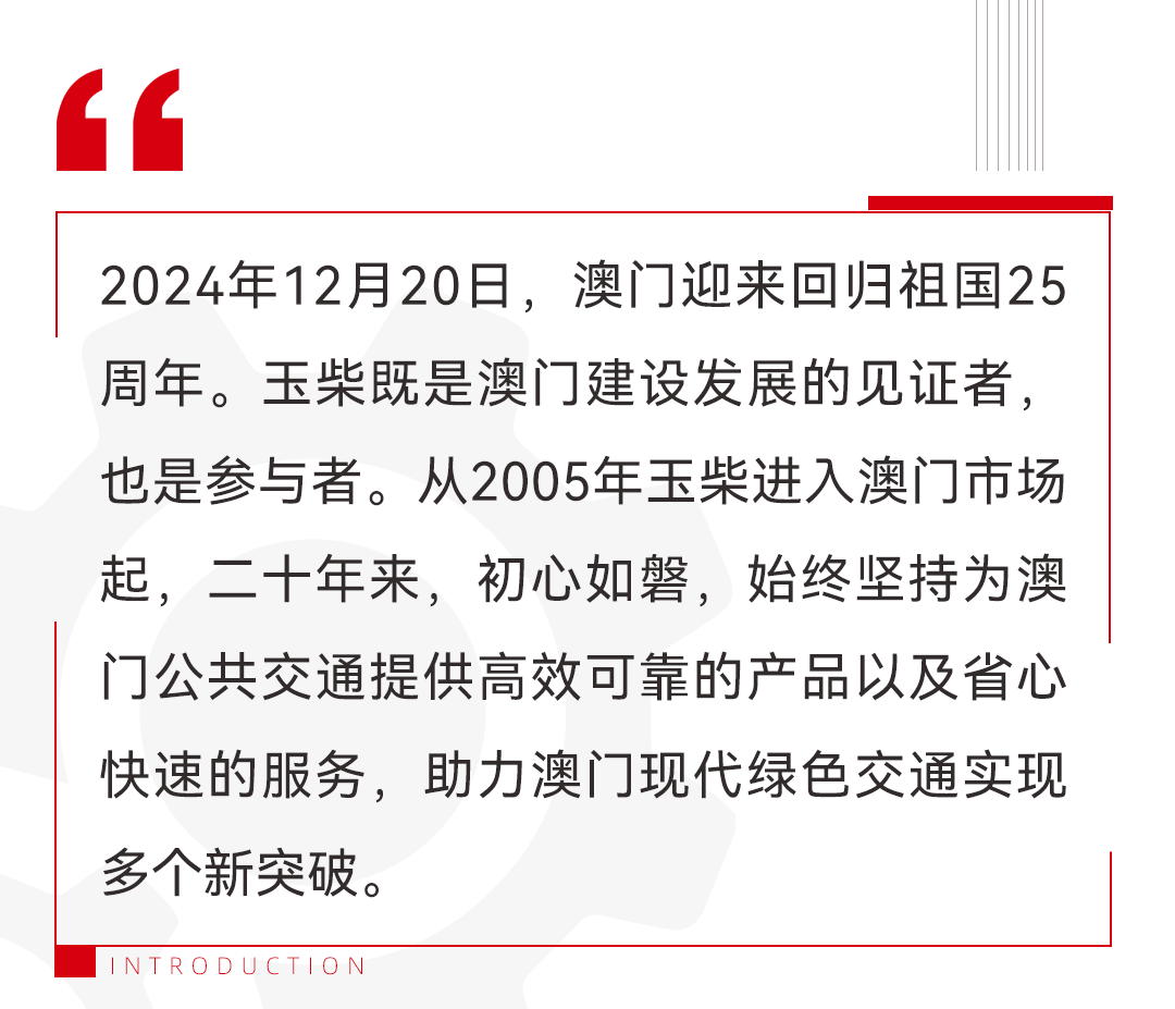 截至2024年12月,玉柴在澳门的市占率超70%,从欧三到欧六排放,玉柴机器始终引领行业并竭诚护航澳门交通发展。