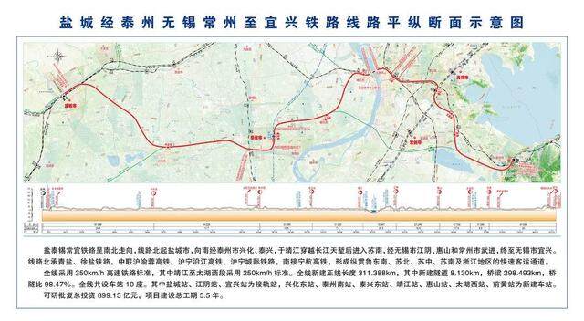 盐宜铁路设计时速350公里,沿途共设10座车站,将与多条横向高铁实现互联互通或接驳换乘,在苏北、苏中、苏南城市之间构筑起“2小时快速交通圈”。