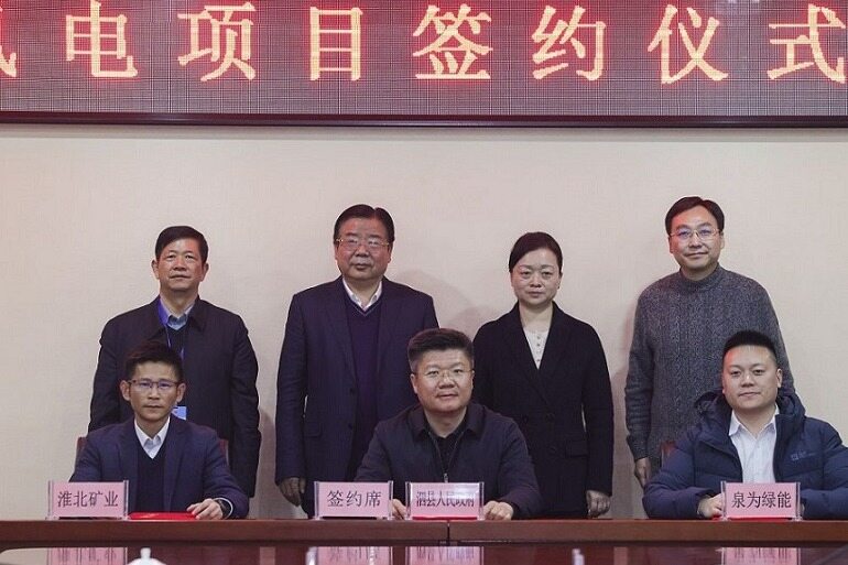 2月14日,淮北矿业集团与泗县人民政府、泉为绿能投资(海南)有限公司举行三方签约仪式,顺利签约300兆瓦泗县风电项目。