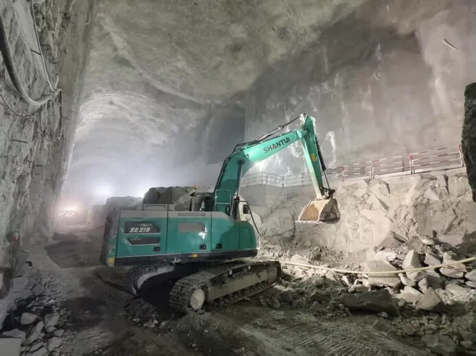 据介绍,该工程项目位于山东省中部,是国家规划建设的重大能源基础设施项目,总投资逾100亿元,需开挖水道系统工程隧道2000米以上,以及引水系统斜井等高难度施工作业,地理环境多变,特别是隧道内施工,面临着空间狭小、粉尘、潮湿等诸多挑战。“隧道内施工,对挖掘机的通过性、操纵灵活性要求极高,这台山推215电动挖掘机,日常操作动作顺畅,连贯性强,尤其适合长时间高强度作业,几乎无动力衰减,而且不需要更换滤网滤芯,即使环境恶劣也不怕,用着不仅省钱还省心。”挖掘机操作手说道。