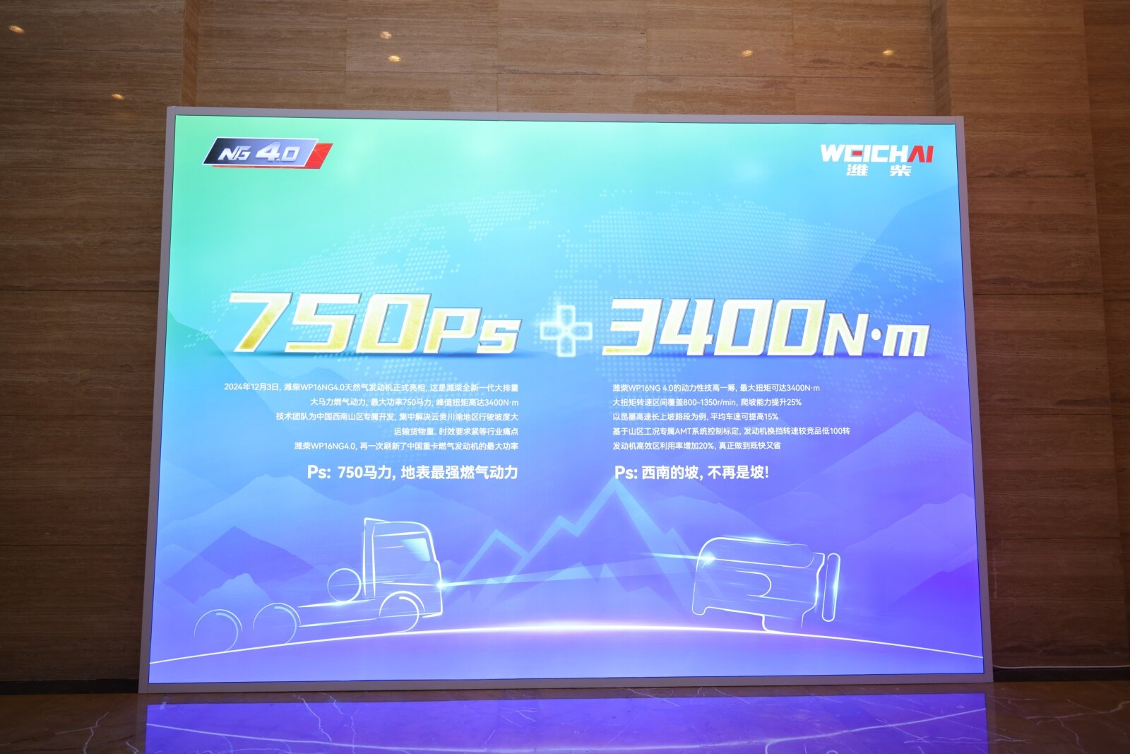 据介绍,WP16NG-4.0发动机是针对西南山区等工况所打造的一款专属动力,延续WP15NG-4.0发动机为人所称道的全新燃烧室设计、双顶置凸轮轴结构,无论是在动力性、经济性,还是可靠性等方面,均有卓越表现,比WP15NG-4.0功率提升19%,车速提升15%;最大扭矩提升21%,爬坡能力提升25%。如此强大的动力,能够让客户真正无惧高山,所见皆坦途。