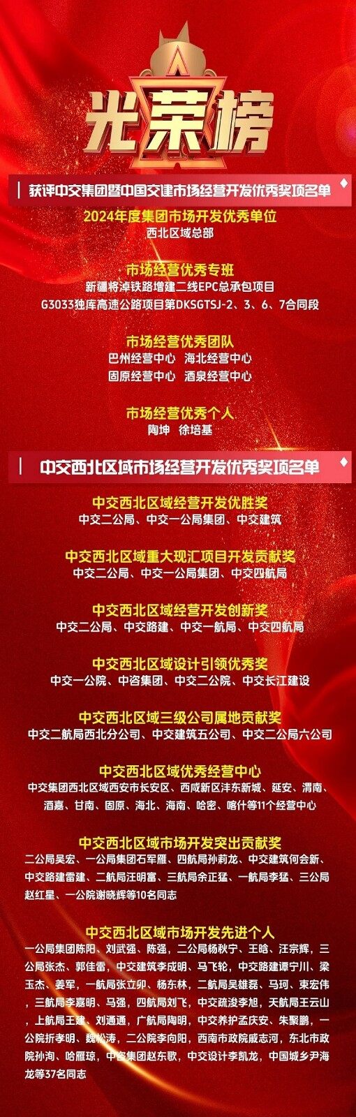 2025年2月20日,在中交集团暨中国交建2025年度市场、投资工作会议上,西北区域总部获得中交集团暨中国交建“市场经营先进单位”表彰,这是西北区域总部连续两年获得该奖项。另有相关个人和项目团队也获得荣誉表彰。
